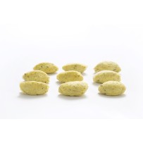 Ingredientes: BACALHAU (Gadus morhua) (51%), água, FLOCOS DE BATATA (batata desidratada, emulsionante E471, antioxidante E304, E300, E223, regulador de acidez E330, tempero e arma natural – contém SULFITOS e derivados de LEITE), fécula de batata, OVO inteiro líquido pasteurizado, azeite, cebola, salsa, pimenta branca, alho e amarelo ovo (E102 e E122). Pode conter espinhas.